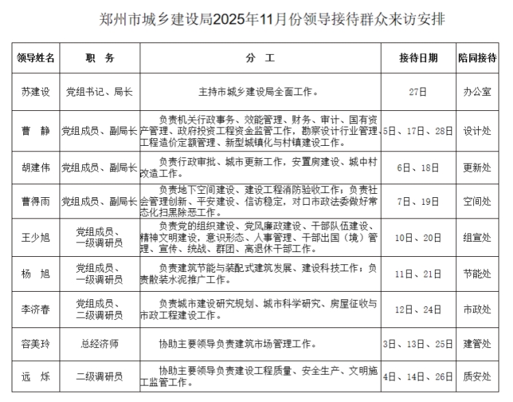 郑州市城乡建设局2025年11月份领导接待群众来访安排公示表