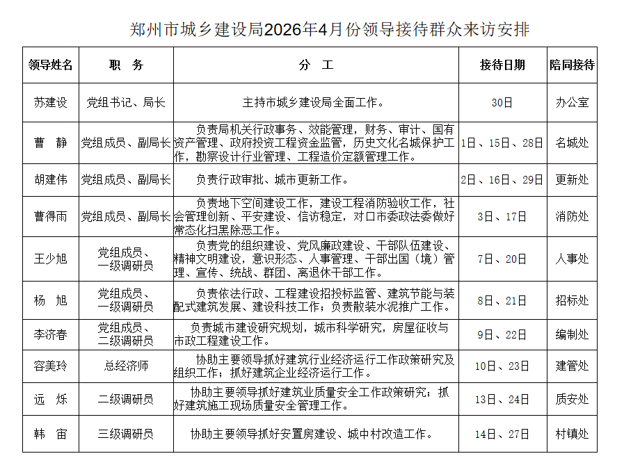 郑州市城乡建设局2026年4月份领导接待群众来访安排公示表